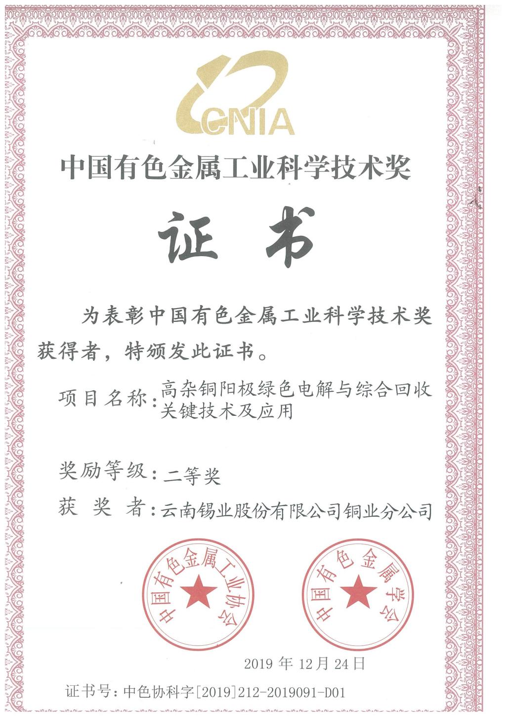 近日,銅業分公司收到中國有色金屬工業協會頒發的榮譽證書,銅業分公司申報的《高雜銅陽極綠色電解與綜合回收關鍵技術及應用》榮獲中國有色金屬工業科技進步二等獎。