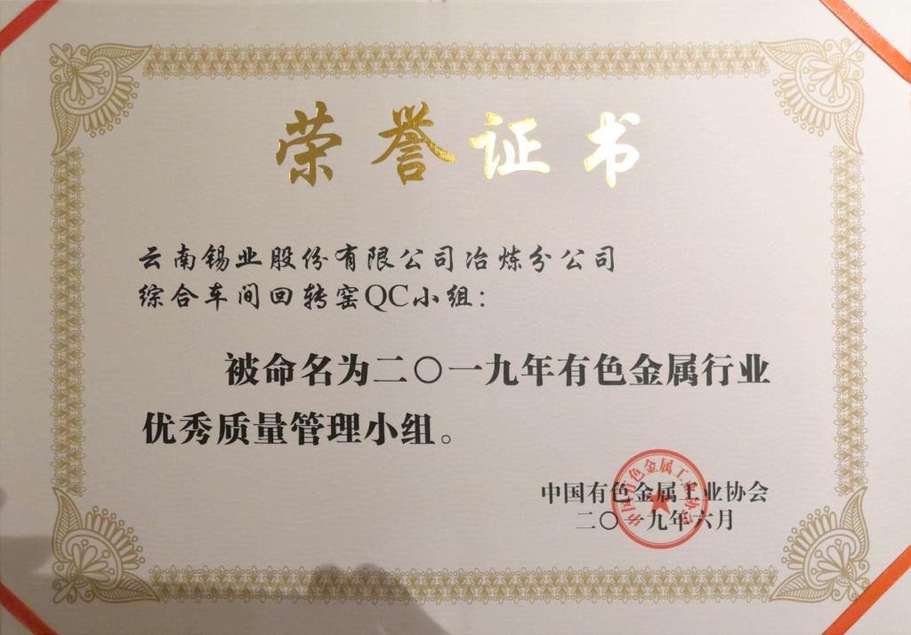 7月10日,在2019年度有色金屬行業(yè)全國(guó)優(yōu)秀質(zhì)量管理小組及全國(guó)質(zhì)量信得過(guò)班組評(píng)審會(huì)上,冶煉分公司綜合車間回轉(zhuǎn)窯QC小組榮獲“全國(guó)優(yōu)秀質(zhì)量管理小組”榮譽(yù)稱號(hào),其QC成果榮獲“囯優(yōu)”獎(jiǎng)項(xiàng),該成果也是云南省有色金屬行業(yè)唯一一個(gè)獲得“國(guó)優(yōu)”獎(jiǎng)項(xiàng)的QC成果。