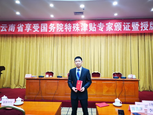 4月12日,在云南省2018年獲國務(wù)院政府特殊津貼專家頒證暨新設(shè)立專家基層科研工作站和省級(jí)博士后站授牌活動(dòng)會(huì)上,老廠分公司竹葉山坑一工區(qū)采礦一隊(duì)隊(duì)長、高級(jí)技師楊勇榮獲2018年國務(wù)院政府特殊津貼。云南省人社廳黨組副書記、副廳長和江峰、副廳長邢渭東、省委組織部人才工作處處長肖峰出席活動(dòng)并為2018年榮獲享受國務(wù)院政府特殊津貼的48位各行各業(yè)專家人才現(xiàn)場頒發(fā)證書。