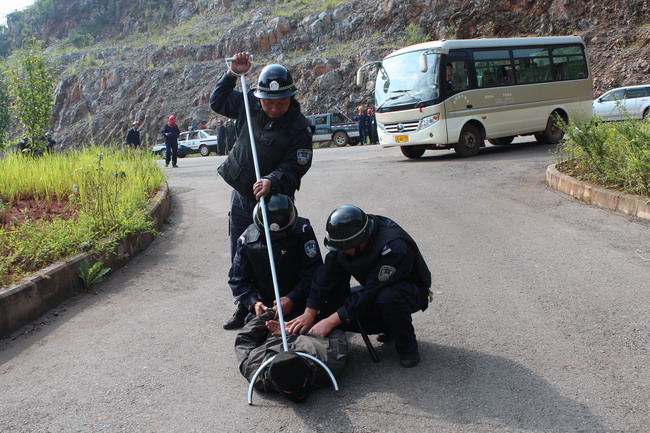 演練設置為早上9點30分左右,在通勤車乘坐點,一群身份不明的人員在職工乘坐通勤車下班時進行突然襲擊,對車間設施進行破壞,其中3名“暴恐分子”在中巴車內(nèi)挾持了3名職工,守護精選工段的保衛(wèi)人員接到報警后,兩名保衛(wèi)人員立即對恐怖分子進行阻擊,另外一名保衛(wèi)人員立即把情況上報給反恐小組辦公室,反恐領導小組迅速啟動應急方案。