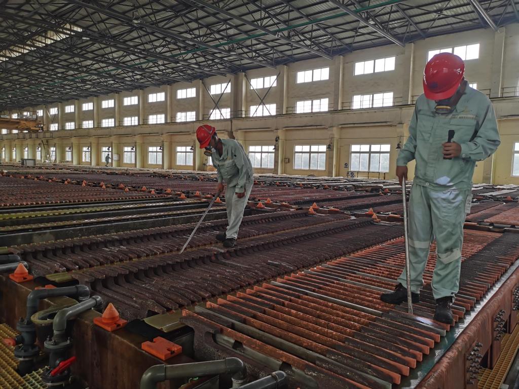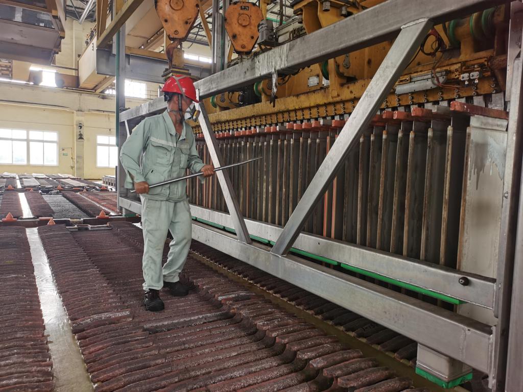 一頂安全帽、一把扁鏟、一身汗?jié)n斑斑的工作服,陪伴出裝槽班組的員工們走遍了電解槽的角角落落。出槽前,出裝組長小毛和行車工小龍一同前往確認(rèn)出槽位置,聯(lián)系循環(huán)崗位,將槽下5系3、4組短路開關(guān)閉合,斷開出槽電流,確認(rèn)無誤后開始出槽。關(guān)閉陰陽極槽進(jìn)液管閥門,接觸點(diǎn)澆一遍電解液,拔開出陰極和殘極槽的上清液鉛塞,排電解液專用吊車起吊陰極和殘極,清洗導(dǎo)電板,清除槽內(nèi)殘存殘極、粒子……每一個環(huán)節(jié)都緊密斜接,每一個步驟都熟悉精準(zhǔn),一個在地上、一個在“空中”,不知多少次的配合,才換來現(xiàn)在的默契。