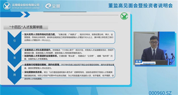董事長、總經理劉路坷介紹了公司資源、業務產業鏈、產品及近期生產經營情況,同時充分闡述了公司未來發展戰略,即圍繞著打造全球錫、銦全產業鏈供應鏈“鏈主”的發展愿景,以“綠色智能補鏈、精深加工延鏈、改革創新強鏈”為發展理念,圍繞資源拓展、現代礦山、原材料制造、新材料和精深加工、供應鏈五個業務單元布局有色金屬全產業鏈,助推上市公司高質量發展。