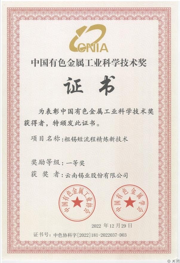近日,中國(guó)有色金屬工業(yè)協(xié)會(huì)、中國(guó)有色金屬學(xué)會(huì)發(fā)布了榮獲2022年度中國(guó)有色金屬工業(yè)科學(xué)技術(shù)獎(jiǎng)項(xiàng)目,由云錫控股公司牽頭負(fù)責(zé),錫業(yè)股份錫業(yè)分公司、昆明理工大學(xué)、綠地環(huán)保共同參與的“粗錫短流程精煉新技術(shù)項(xiàng)目”榮獲2022年度“中國(guó)有色金屬工業(yè)科學(xué)技術(shù)獎(jiǎng)一等獎(jiǎng)”。