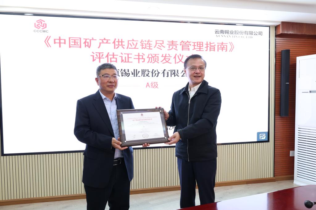 近日,中國五礦化工進(jìn)出口商會會長江輝、發(fā)展部主任孫立會,及倫敦金屬交易所負(fù)責(zé)任工商經(jīng)理楊茗友一行到訪云錫,與云錫控股公司領(lǐng)導(dǎo)楊奕敏、錫業(yè)股份黨委書記、董事長、總經(jīng)理劉路坷開展座談,并向錫業(yè)股份頒發(fā)《中國礦業(yè)供應(yīng)鏈盡責(zé)管理指南》評估證書。