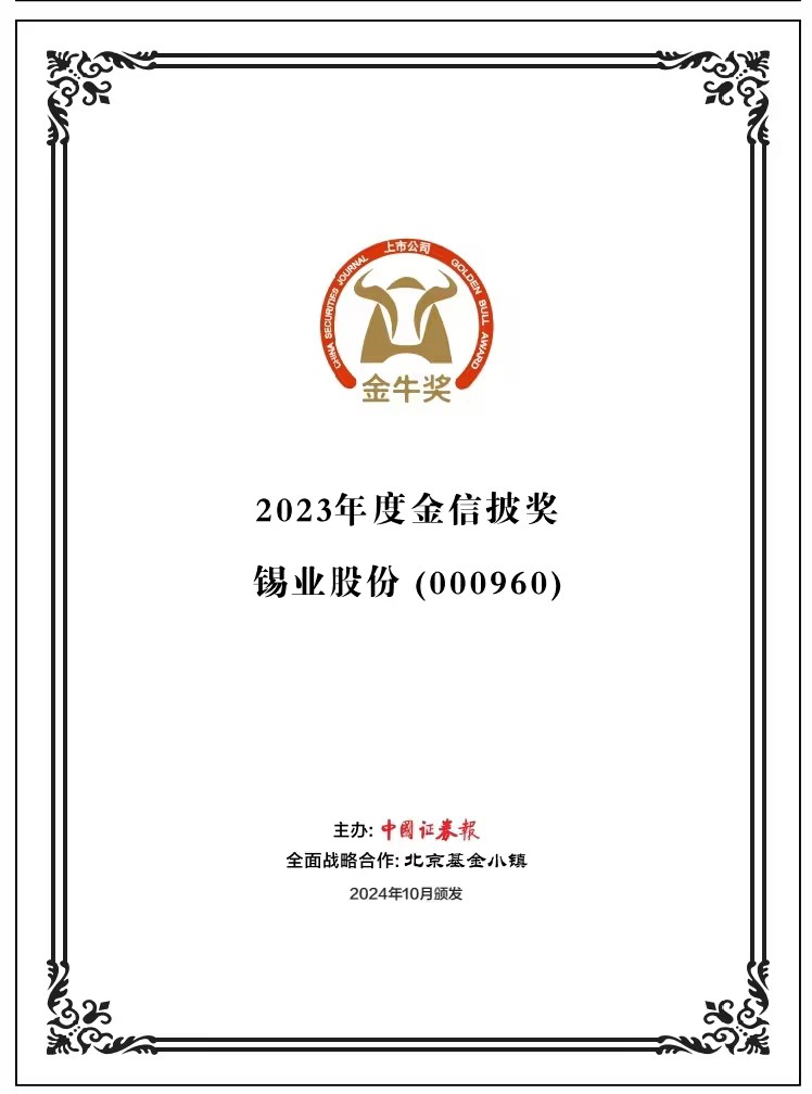 10月24日,中國證券報(bào)正式揭曉了2023年上市公司金牛獎榜單,錫業(yè)股份(000960)榮獲“2023年度金信披獎”。從評價結(jié)果統(tǒng)計(jì)來看,入圍參選樣本的4208家A股上市公司中僅有不超過450家獲獎,占入圍上市公司總數(shù)不到11%。“2023年度金信披獎”評價重點(diǎn)考慮上市公司的信息披露質(zhì)量和效率。評選組委會根據(jù)上市公司年報(bào)質(zhì)量、審計(jì)情況、交易所信息披露考評等指標(biāo)進(jìn)行綜合判斷,并最終評選出在信息披露方面表現(xiàn)較為突出的上市公司。