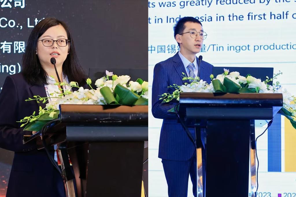 錫業股份審計風控部經理楊薇主持“可持續發展挑戰與機遇”環節;錫業股份市場運營中心張哲語作《中國錫市場展望》報告。