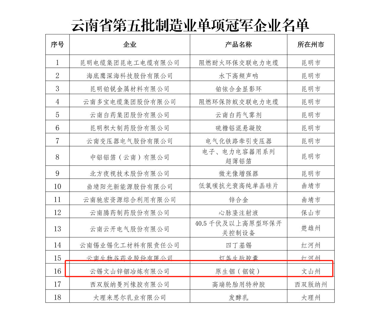 1月9日,云南省工業和信息化廳正式公布了“云南省第五批制造業單項冠軍企業名單”,文山鋅銦憑借在主導產品——原生銦(銦錠)領域的卓越貢獻與持續創新,榮獲“云南省第五批制造業單項冠軍企業”稱號。