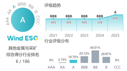 近日,萬得(Wind)更新了2025年最新ESG評級結果,錫業股份Wind ESG評級由過去連續4年的BBB級首次提升至A級,在金屬與采礦行業186家納評上市公司中目前排名第6(AA和A評級分別僅占2%和10%,目前暫無AAA評級企業)。在此次評級中,錫業股份ESG綜合得分為7.91分,在環境、社會、治理三個維度得分分別為6.95、8.27、5.77,均處于行業前列。